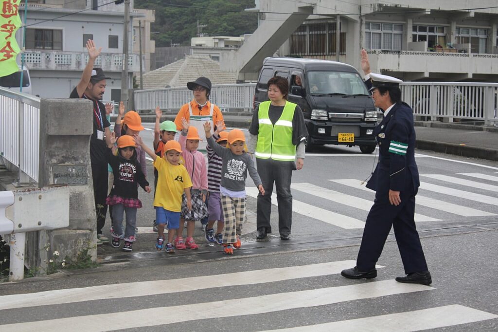 今日は、本部警察署から交通課のおまわりさんと交通安全協会の職員さんが来て下さり、交通安全指導が行われました。安全指導恒例のコウちゃん(腹話術のお人形)が登場すると、子ども達みんな大興奮!!「みんなのいのちはひとつなんだよ」と、交通安全を通して命の大切さを学びました。その後はきりん組さんを対象に、歩道を歩く際の注意や横断歩道のわたり方などを教えて頂きました。