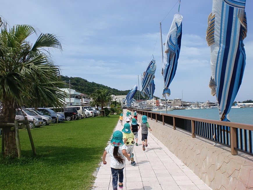 ゴールデンウィークの風物詩としてすっかり定着した本部のカツオのぼり。今日の一コマは、そのカツオのぼりをバックに、みんなテンションMAXの状態で町立図書館へ孟ダ~ッシュ!!