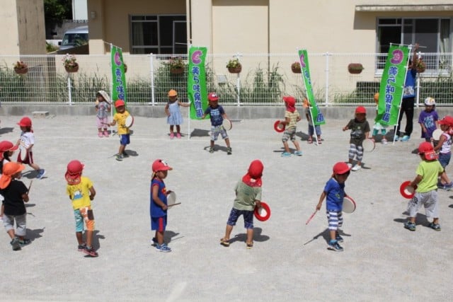 さて、今日は「第44回本部海洋祭り」きりん組にとっては、今年度の園外出演デビューです‼18名の子ども達と、うさぎ組の子ども達も旗持ち役で初参戦‼