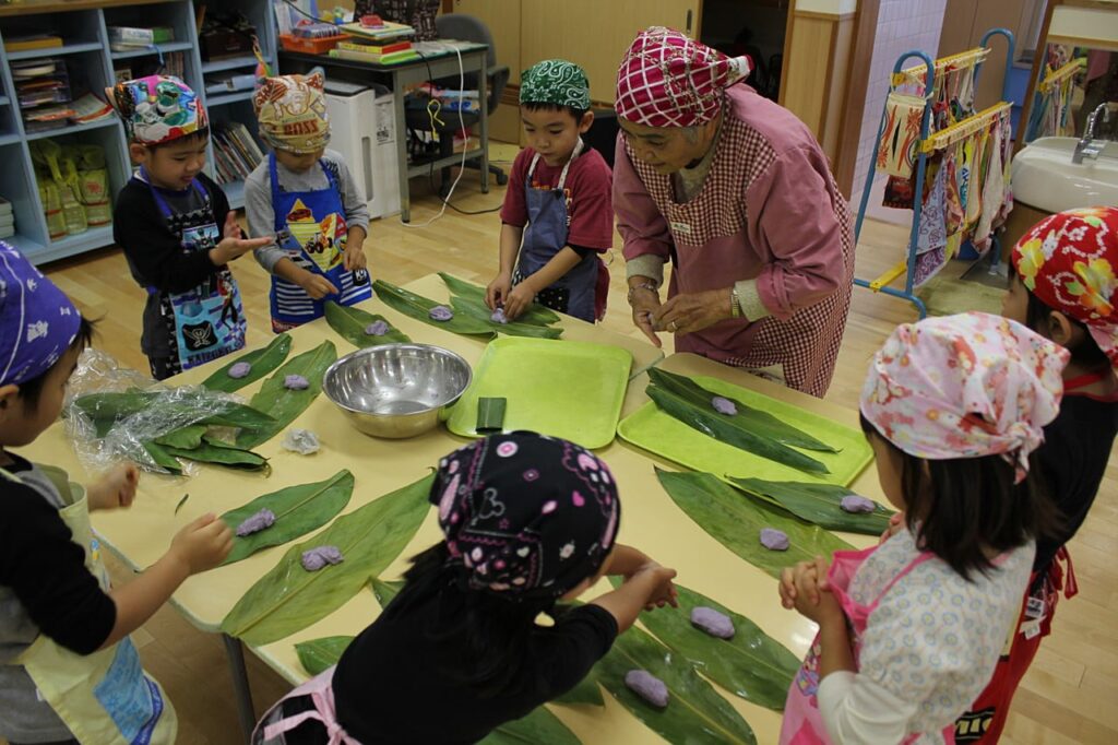 毎年、近所のおばあちゃんをご招待して子ども達と一緒にムーチー作りをしますが、今年も4名のおばあちゃんにご参加頂きました。子ども達はおあばちゃん達の指導を受け、どの子も興味津々。おもちをムーチーガーサに包み終わった後は、昔ながらのお手玉遊びや折り紙をして遊びました。おばあちゃん、また遊びに来てね~!!