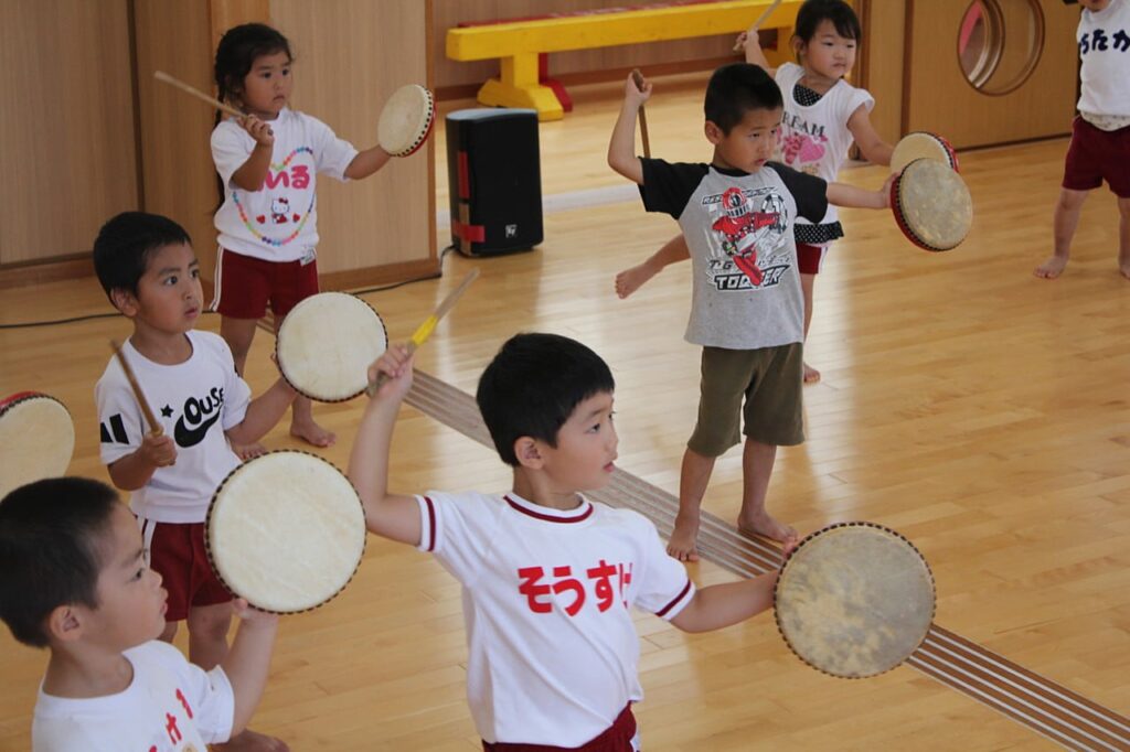 さて、昨年から取り組んでいる沖縄の郷土芸能「エイサー指導」その初稽古が先日行われました。初日は、柔軟体操に始まり、エイサーに取り組む姿勢、使用する様々な太鼓の種類を学びました。そのうち、獅子舞も出て来るかもね…。昨年度のきりん組さんは色々なステージで大活躍でしたが、今年のきりん組さんは如何に…。やはり去年のカッコいい先輩たちを見ていたせいか、練習初日からどの子も気合十分!!元気いっぱいに初稽古に取り組んでいました。今年も、昨年同様きりん組さんの活躍が期待できますね!!