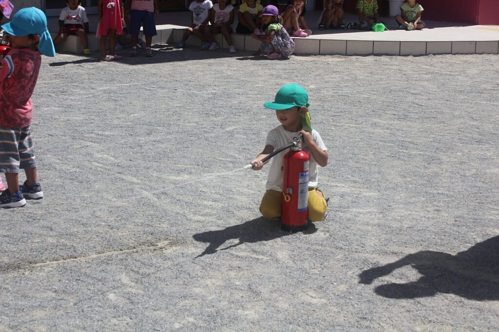 園職員が正しい消火器の使い方をレクチャーされた後、消防署さんの計らいで子ども達も消火体験!!子ども一人で消火器を持つのは重たいので、2人1組で行いました。
