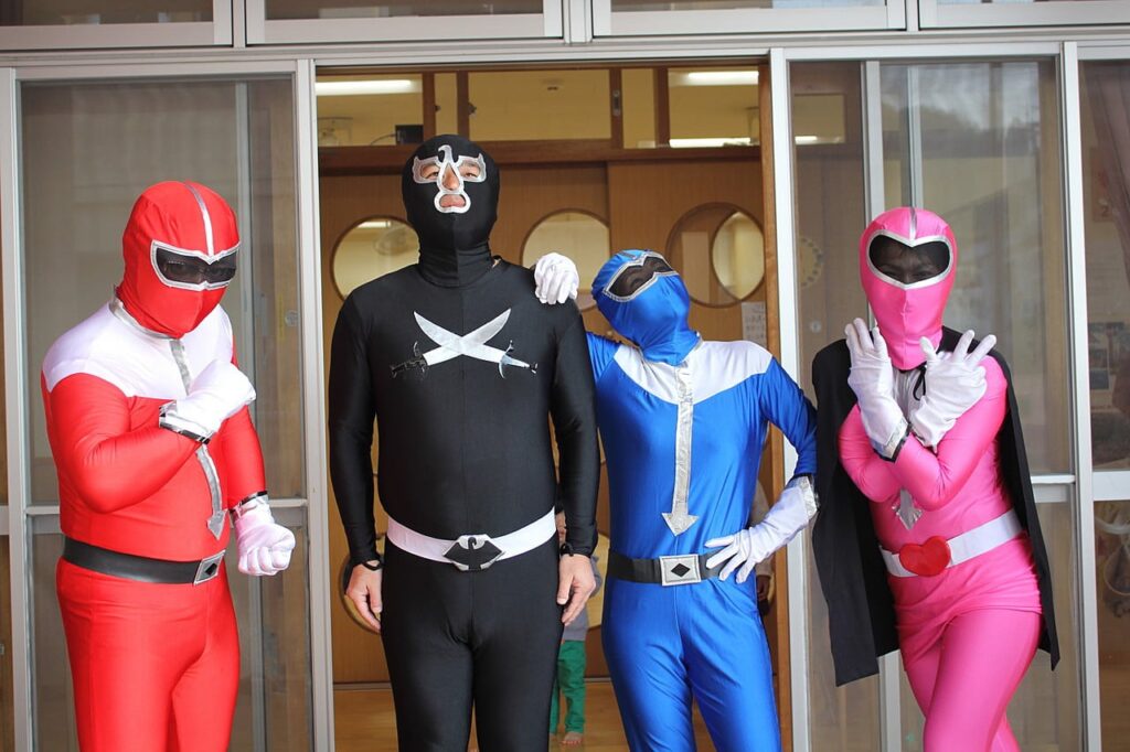 さて、今朝の登園時間に珍客が…。お隣の本部小学校で、登校時間の挨拶運動にて大活躍中の!?「挨拶レンジャー隊」が、ちょっとだけ美ら咲保育園に参上!!実は、美ら咲保護者OBの皆様なのです…。何も聞かされていない子ども達は大パニックに!!でもレンジャー隊の帰り際には、しっかりと挨拶出来た子ども達でした♪挨拶レンジャーのみなさん、また来てね~!!