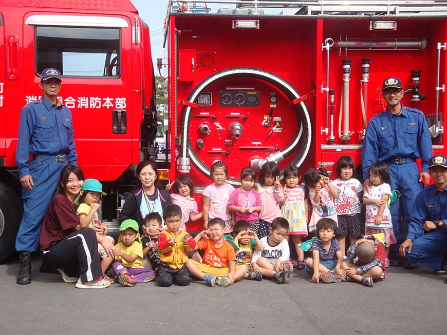 さて、去った9日が119番の日と言う事で、新築した本今消防今帰仁分遣所にきりん組・うさぎ組のみんなでお邪魔しました♪