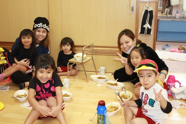 みんな一生懸命頑張った後は、保育園に戻って「親子カレーパーティー」で楽しみました。