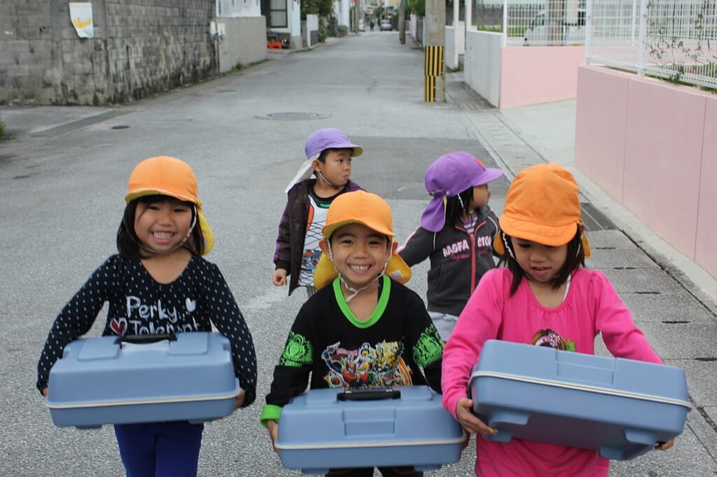 今日は、月に2回の高齢者給食サービスの日。2世帯、3人分の給食を配達します。寒空の中、選ばれた5人のお友達が配達にしゅっぱ~つ!!配達の道中、この間の交通安全指導で習った道路の渡り方を確認しながら、高齢者の御自宅へ無事に届けることが出来ました。