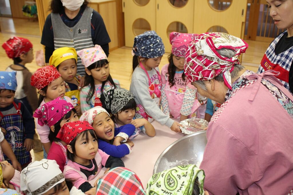 沖縄の伝統行事ムーチーの日と言う事で、毎年恒例の「鬼ムーチー作り」を行いました。今年も、地域のおばあちゃんも元気に参加しました。鬼ムーチーの由来を知る為に、大型絵本の読み聞かせの後、ムーチーの作り方をおばあちゃんに教えて頂きました。最初はぎこちなかった子ども達も次第に手馴れていき、きれいにお餅をカーサー葉に包みました。