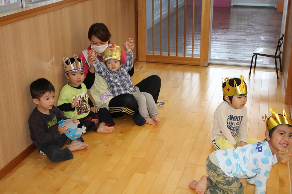 さて、今日は1月生まれのお誕生日会♪1歳児~3歳児までの、今回は5名全員男の子!!が主人公です。