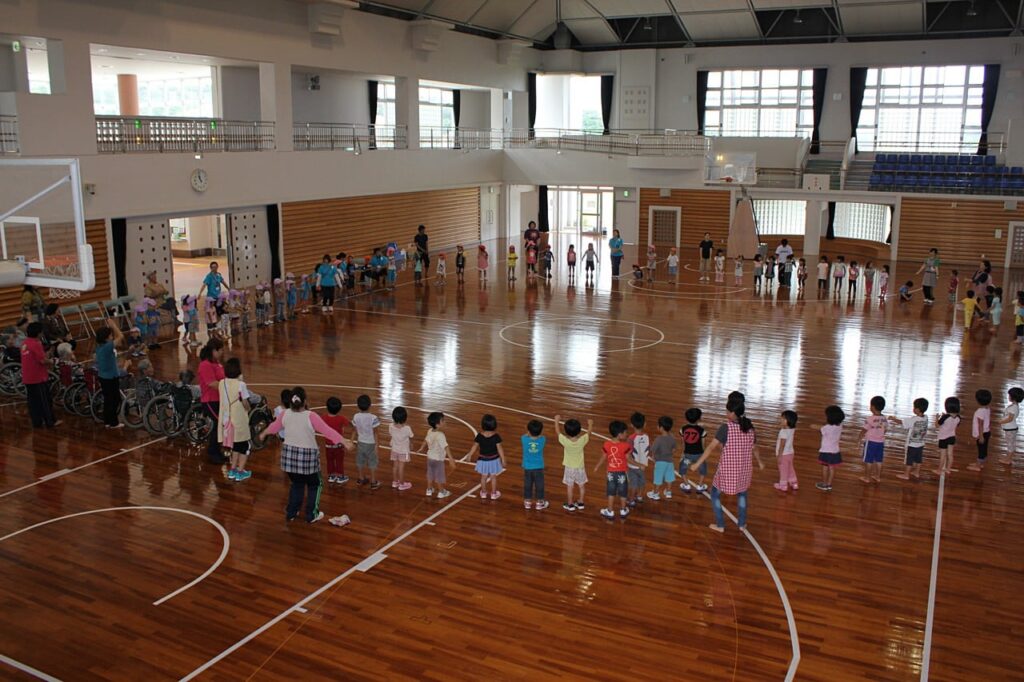 さて、今日は4施設(ドリーム保育園・美ら咲保育園・風のわ保育園・どりーむはうす)の合同ハイクが行われました。八重岳入口から桜の森公園までハイキングした後、4施設交流会を行う予定でしたが、今日もこのようなお天気でしたので、町民体育館での交流会となりました。みんなで「赤田首里殿内」を歌ったり、子ども達からおばあちゃんへの質問タイムなど、少しの時間ではありましたが楽しいひとときを過ごしました。