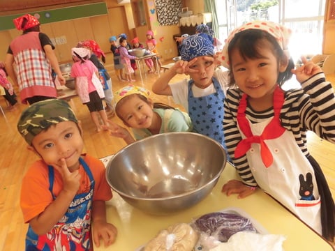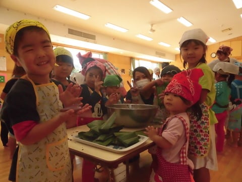 早いもので今年もウニムーチーの季節になりました。餅粉とこしあんにふかした紅イモを一緒にこねて、さんにんの葉で包みます。2歳から4歳児の異年齢が入り混じっての活動は賑やかで楽しいひと時となり、子どもたちの小さな手で一生懸命こねたお餅は香ばしく美味しいウニムーチーになりました。