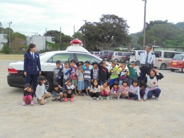 不審者とは全く縁がなさそうなのどかなヤンバルですが、昨年、今年と不審者騒ぎがそれも小学校の周辺で起きています。備えあれば憂いなしということで、ご覧の通り、不審者訓練を実施しました。ドリーム保育園には現在2本のさすまたを置いていますが女性の力では簡単に奪われることを警察官から指摘され、もう2本増やすことも検討しています。訓練後はパトカーの前で写真に納まる子どもたち。本部署の皆さん、ご指導ありがとうございました。