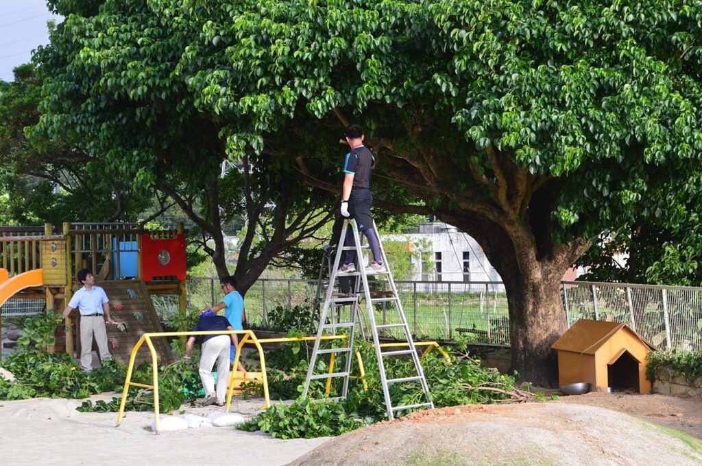 4月23日(土)の午後3時頃から約2時間にわたり、園庭やグランド周辺の草刈り、グランドのデコボコ整地、そして園庭の遊具や段差に砂入れ土嚢をセットしたり、子どもたちが安心して遊べる環境にするべく、どの保護者も協力して作業に取り組んでくれました。ありがとうございました。