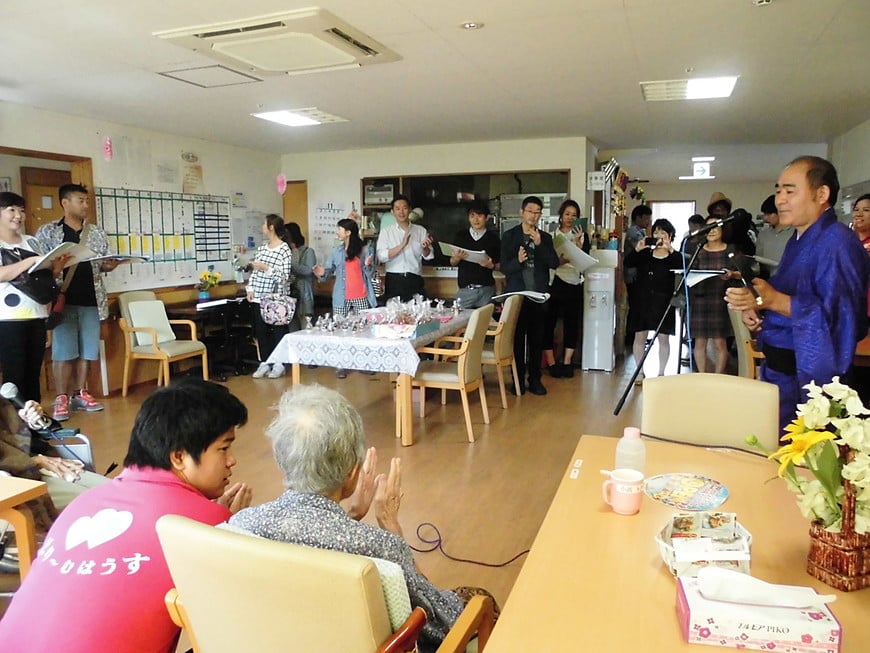 利用者様が大好きな琉球民謡を是非見てみたいとの希望もあり、はうすスタッフの漢那さん(師範)がミニ民謡ショーをしてくれました