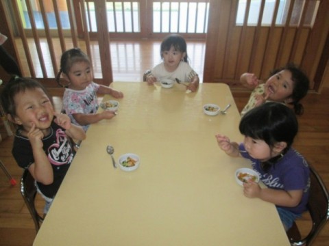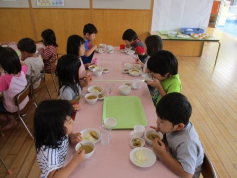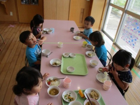 当園では、第3水曜日がお弁当の日としてご家庭よりお弁当を持たせていただいており、その他の曜日は給食をお出ししています。また延長保育時間にはおやつをお出ししております。