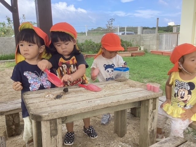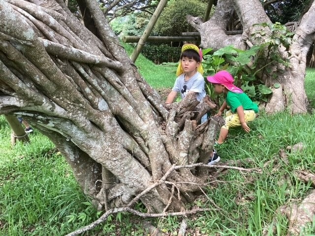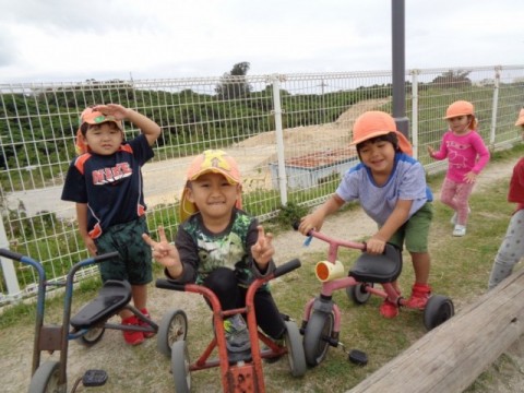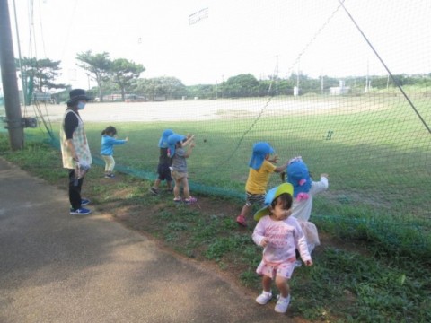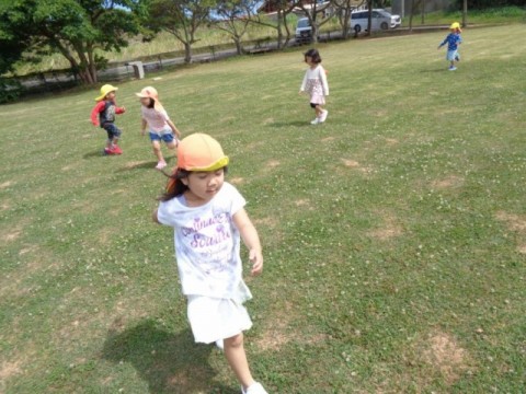 風のわ保育園の近隣には、謝花グランドがあります。午後は地域の小学生が野球の練習場となっていますが、午前中はほとんど人がいないので、貸し切り状態で広場を駆け回り、バッタやてんとう虫、まつぼっくりを拾ったりして自由に遊べる場所があります。子ども達の楽しい憩いの場所となっています。