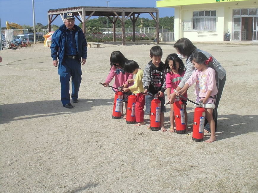 職員の消火器の実践の後に4,5歳児の園児が代表で消火器の使用方法を学びました。