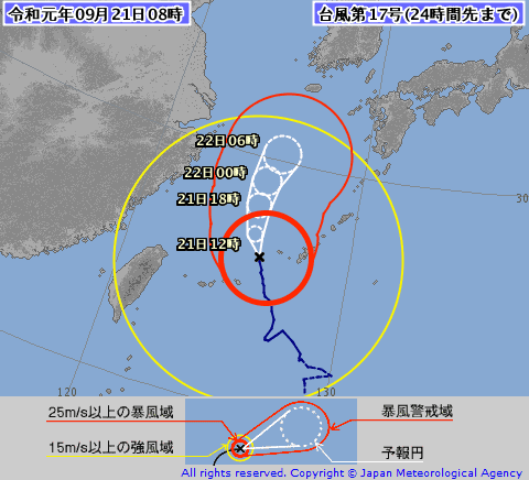9月21日、台風17号が沖縄本島に接近し暴風警報が発令されました。予報では午後6時までの見込みとなっています。