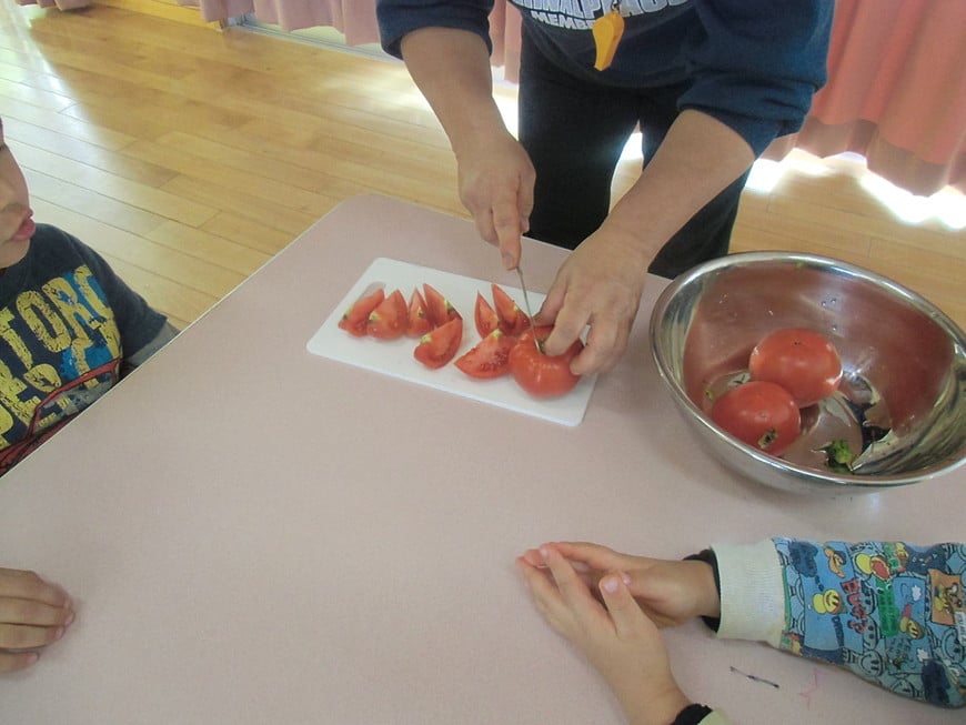 大きな真っ赤なトマトに感激、すぐに保育園に帰ってトマトを頂きました。
