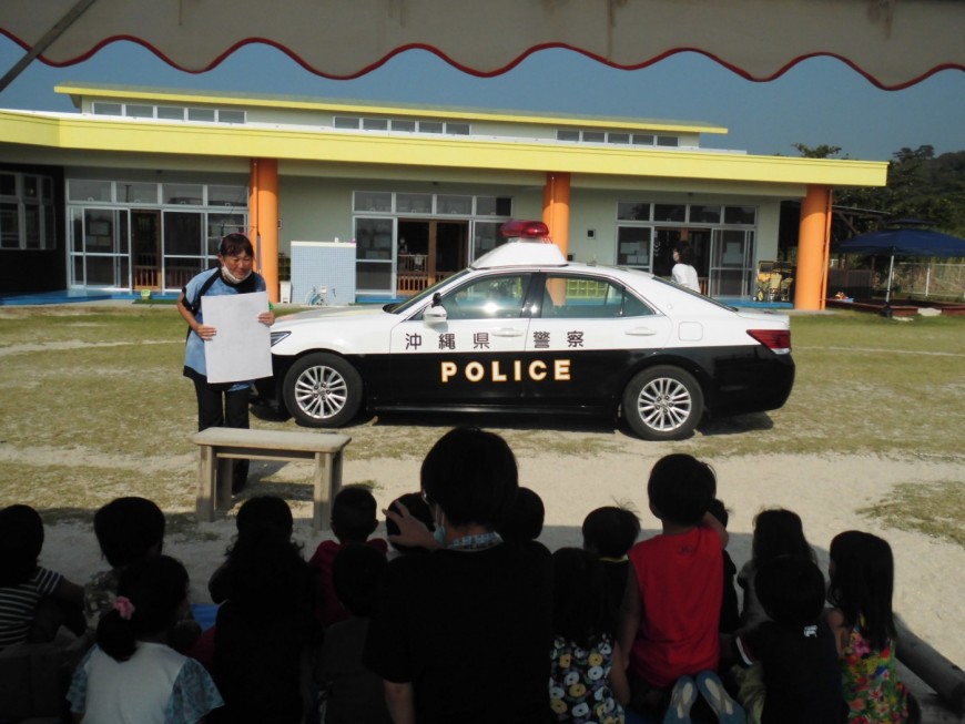 先週予定していた、交通安全出発式が雨天の為中止になり、急遽渡しそびれていたプレゼントを届けに本部警察署の方が来てくれました。最初に本部警察署の方が『いかのおすし』について、紙芝居でお話をしてくれて、子ども達も真剣な眼差しで質問にも答えていました。又スペシャルサプライズゲスト『ブトモ』を呼んだ途端に子ども達の黄色い声援が飛び交い、大人気で身体をなでたり、握手をしてもらったり喜んでいました。また、実際にパトカーにも試乗させてもらい楽しい時間を過ごしました。